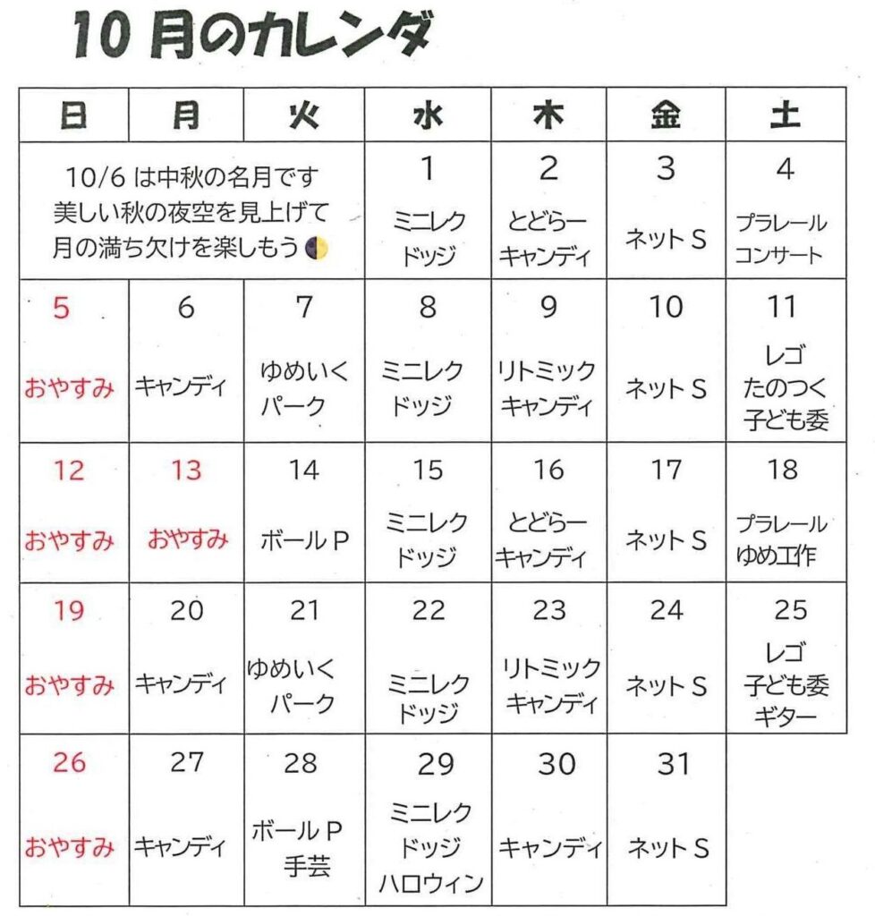 - 10月のお知らせ寒暖差も大きいですが、体調をくずさずゆめいくで元気にあそぼう!