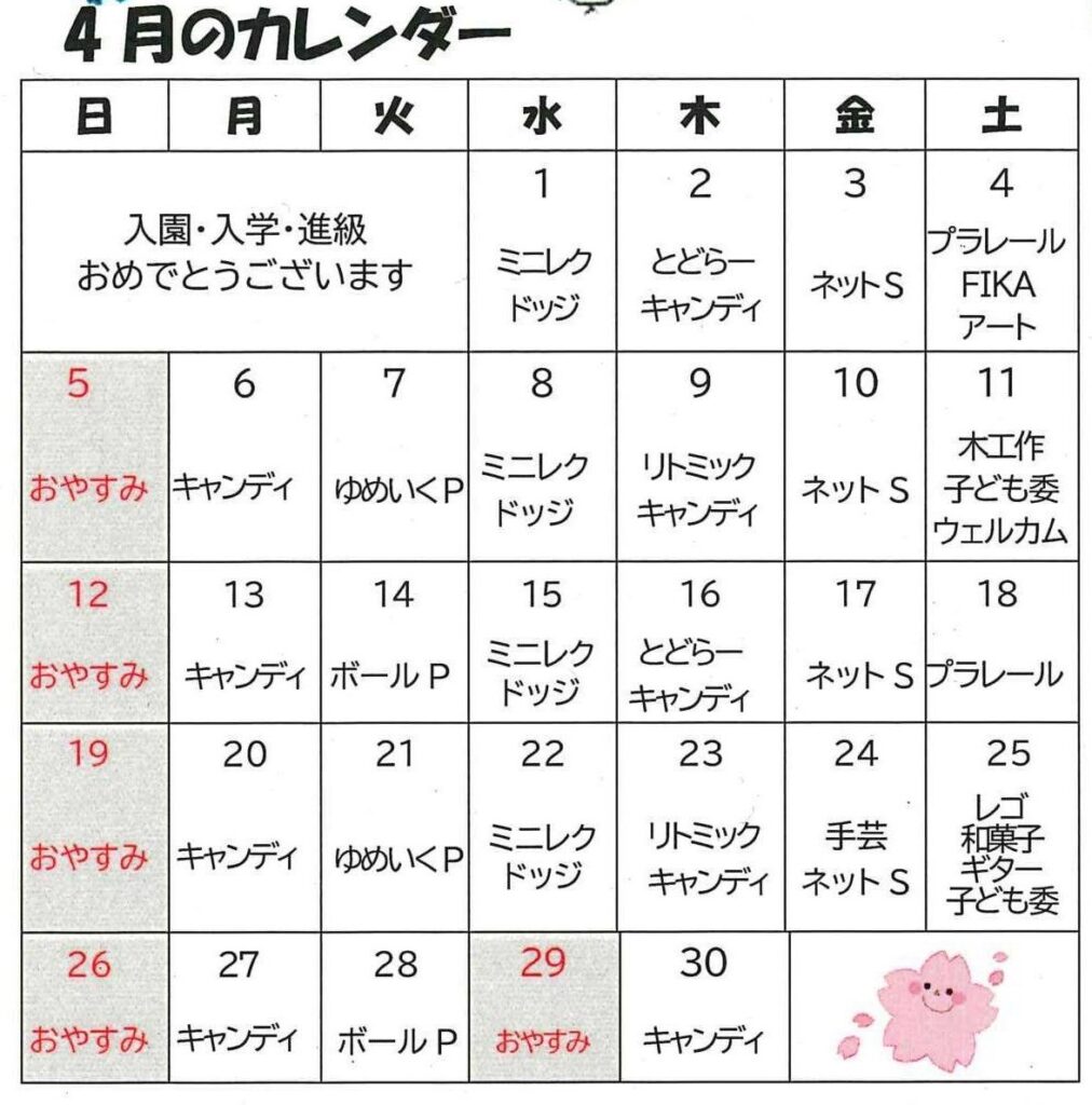 - 4月のお知らせ入園、入学、進級おめでとうございます!新年度もゆめいくで元気にあそぼう!